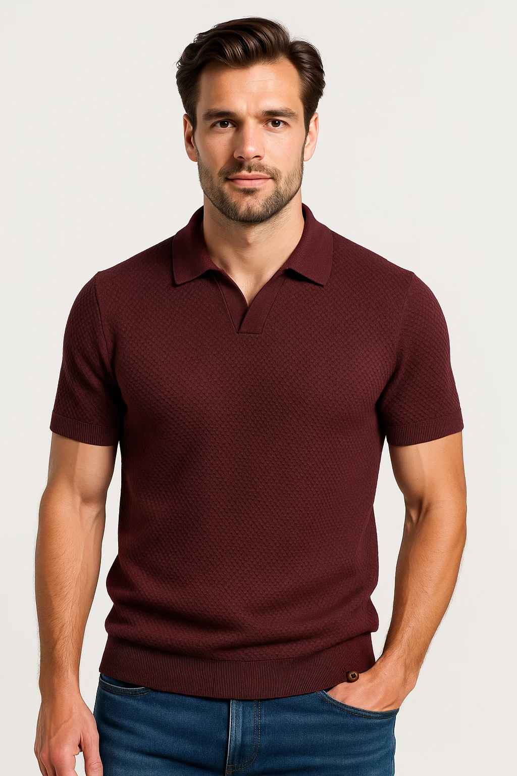 Effortlessly refined, the Adam polo in rich maroon features a ribbed textured finish and a clean, buttonless neckline. Its modern silhouette offers a relaxed yet composed look, perfect for everyday wear with a touch of sophistication. Crafted from a soft, structured knit, this piece brings comfort and subtle elegance to any setting, casual or elevated.